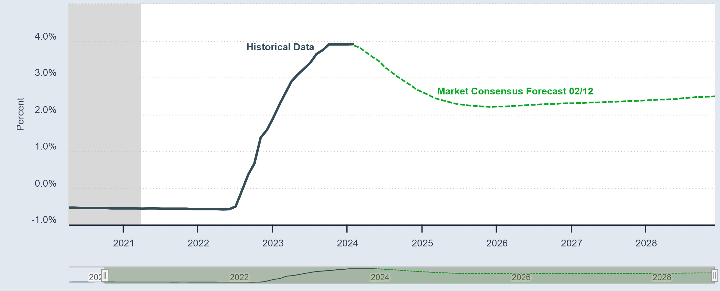 If you ask me, what does this mean for markets? I’d tell you that these statistics and data indicate that monetary policy may differ from the market-priced stance and keep the rates at current levels until after FOMC officials are certain that inflation is at the Federal Reserve’s price stability goal. Powell’s stance is neutral; recent comments indicated that the Federal Reserve’s FOMC will likely wait beyond March 2024 in order to cut rates, as FOMC officials are looking for more statistics to confirm that inflation has reached the Federal Reserve’s price stability goal. For the moment, markets keep betting on the most optimistic outcome, which is the soft-landing path.