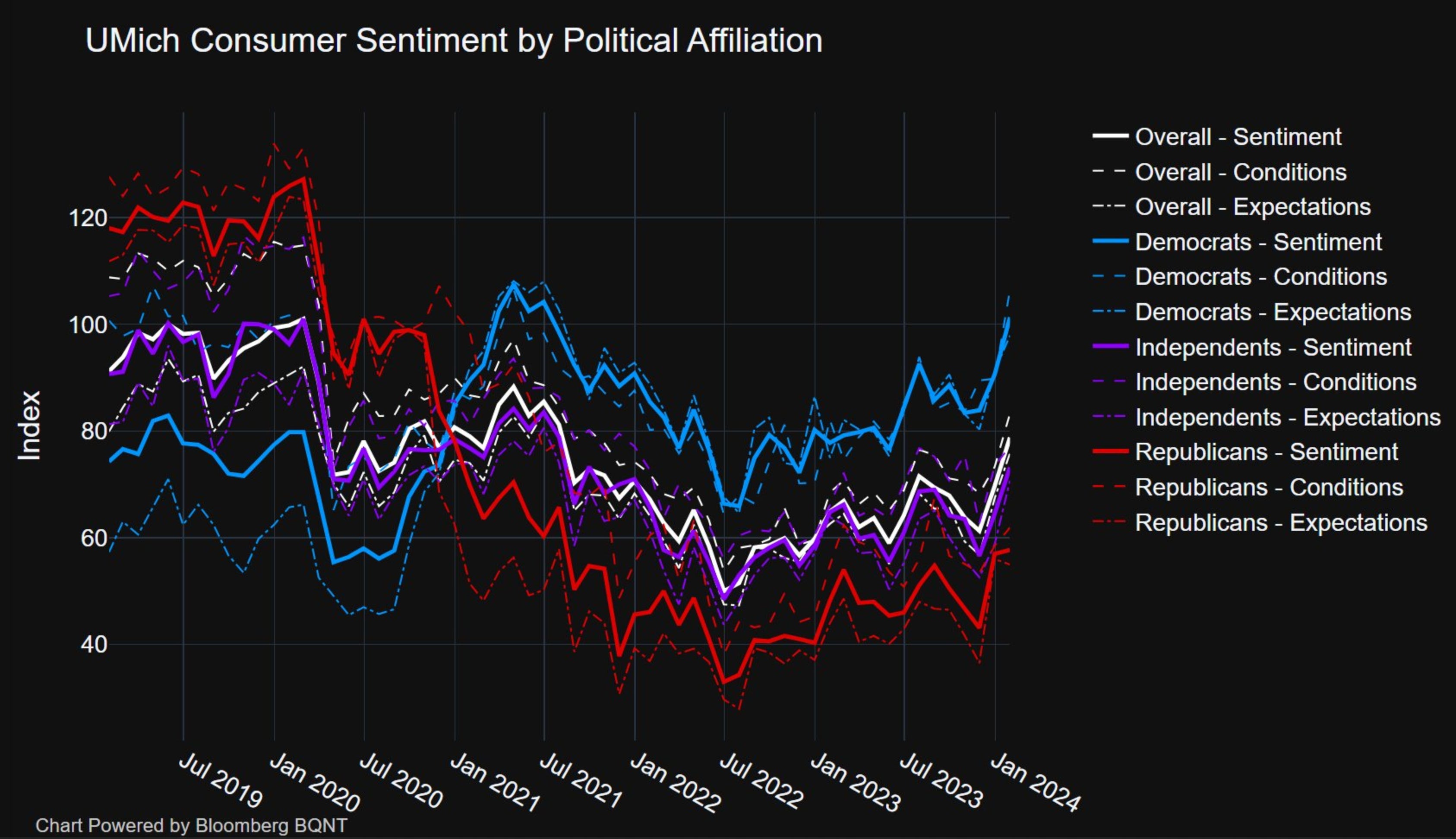 The United States is performing in the range of expectations; statistics continue to show the strength of the consumer and consequently the health of the economy; this is reflected in the continuing improvements in consumer sentiment. Democratic-affiliated Americans’ sentiment is almost at lustrum highs, while Republican-affiliated Americans’ sentiment stalls. Overall, Americans’ sentiment has risen, as can be seen in the next two charts.
