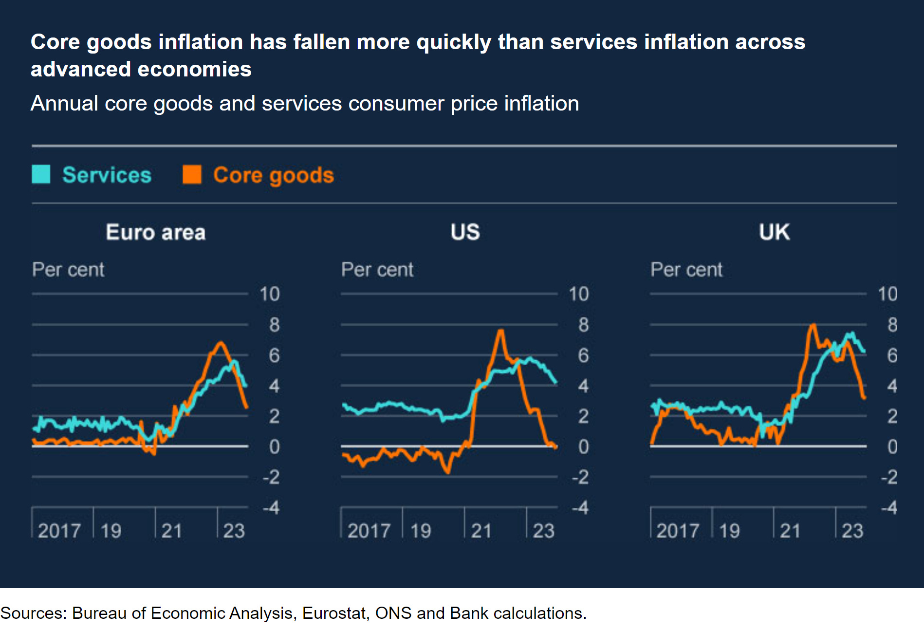 United Kingdom’s inflation has eased but still has not yet reached the Bank of England’s price stability goal, the United Kingdom’s Inflation is mainly supply-driven, something that is interesting is the fact that the United Kingdom’s services inflation is higher than core goods’ inflation, both statistics have eased at different pace but still remain elevated compared to other advanced economies.