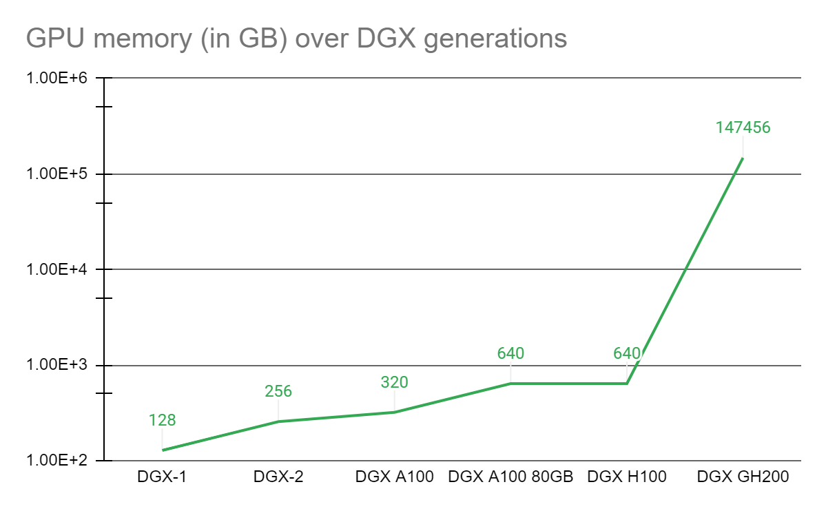 These statistics show a sell the news kind of positioning as everyone is talking about Artificial Intelligence which is a top signal, as pointed out before. This doesn't mean that Artificial Intelligence-related companies won't have growth in the future, but rather is a precautionary signal for markets. Artificial Intelligence is quickly evolving, and with supercomputers advancing at gigantic steps, there is undeniable future growth in this technology, but short-term prospects remain cautious given the previously mentioned reasons. As an example of the evolving AI technology, the next chart shows Nvidia's advancements in AI workloads with the first 100-terabyte GPU memory system.