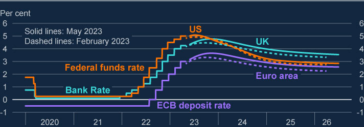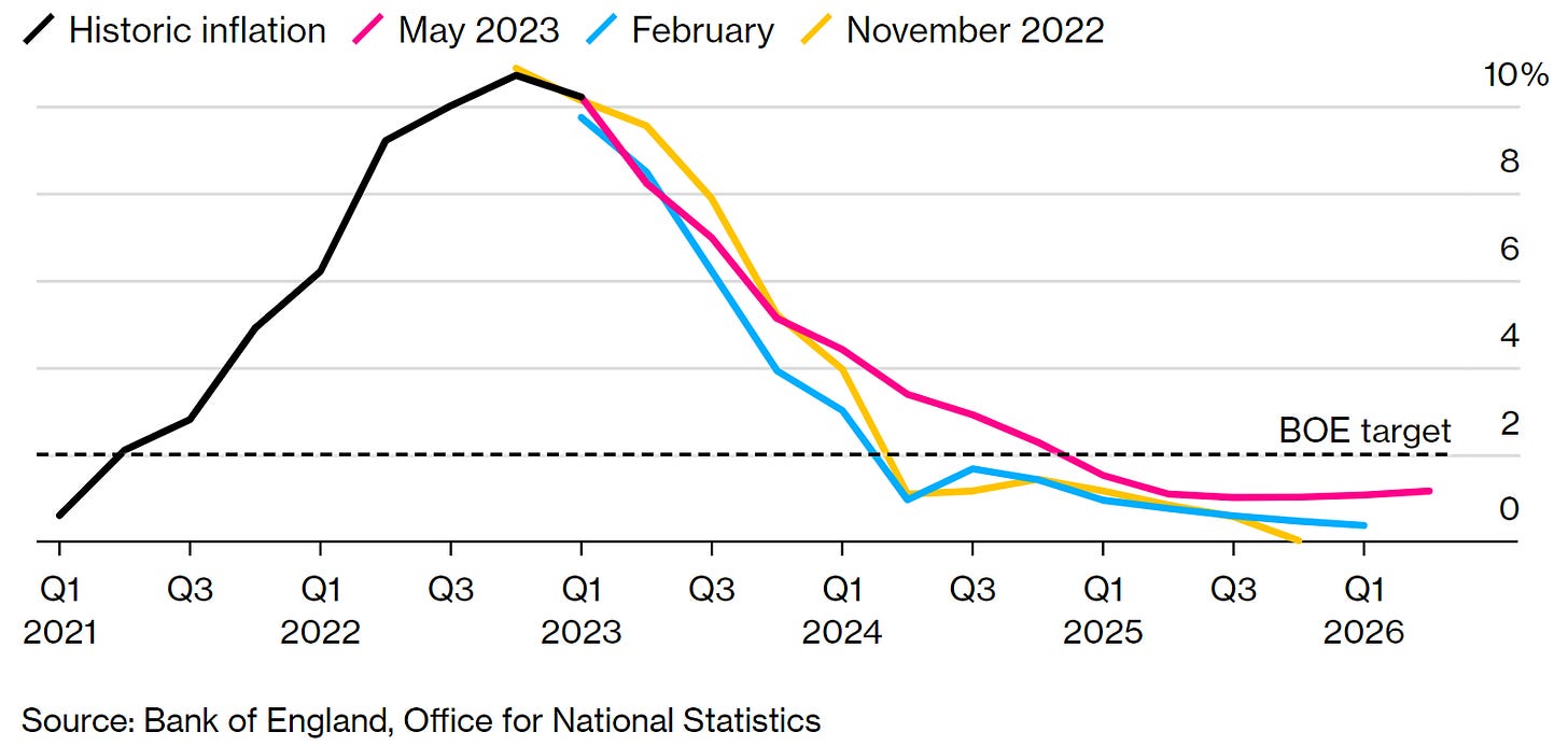 Folks, the United Kingdom's prudent fiscal policy measures are lowering the high cost of living of people in the United Kingdom, but some recent legislative measures might increase some inflationary pressures, which might make monetary policy shift more hawkish in the long run as those legislative measures don’t cause an immediate effect on inflation but rather have sequential effects on supply and demand side inflationary pressures. The United Kingdom’s markets have been repricing it for the past 3 months; therefore, the worst is not yet to come, as the International Monetary Fund (IMF) has pointed out. Overall, the Bank of England’s soft-landing path is achievable, but will take longer than its major peers. The Bank of England’s Monetary Policy Committee inflation projections are realistic rather than pessimistic, as can be seen in the next charts.