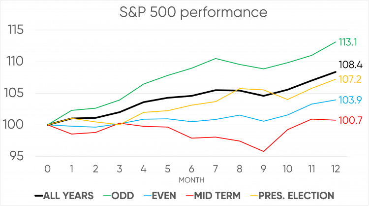 Figure 10. S&P 500 Performance in Odd, Even, Mid-Term, and Presidential Elections.