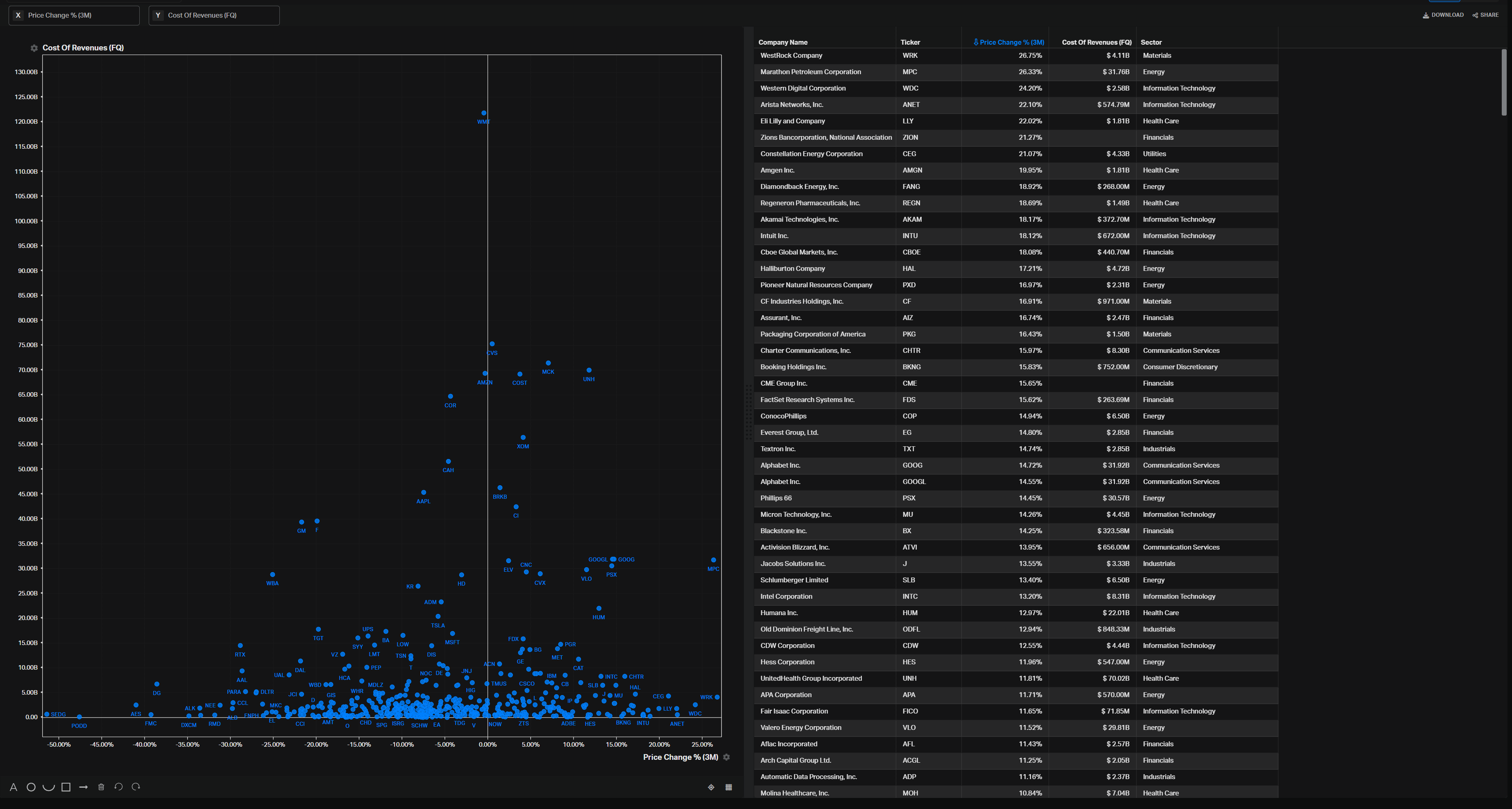 Markets are behaving in the range of expectations, recent months' increases in energy sector prices reduce the upside of some sectors of the market, specially of risk-on sectors such as high beta and discretionary sectors; due to two factors: more than likely consumer spending shifts from discretionary spending to energy, utilities, staples... ( i.e., consumer spending shift from non-essential towards essential spending ) and increased Cost Of Revenues of discretionary sectors given increased/increasing energy prices, the next chart shows the current 3-month performance of the S&P500 companies and their Cost Of Revenues as of their latest quarter release.