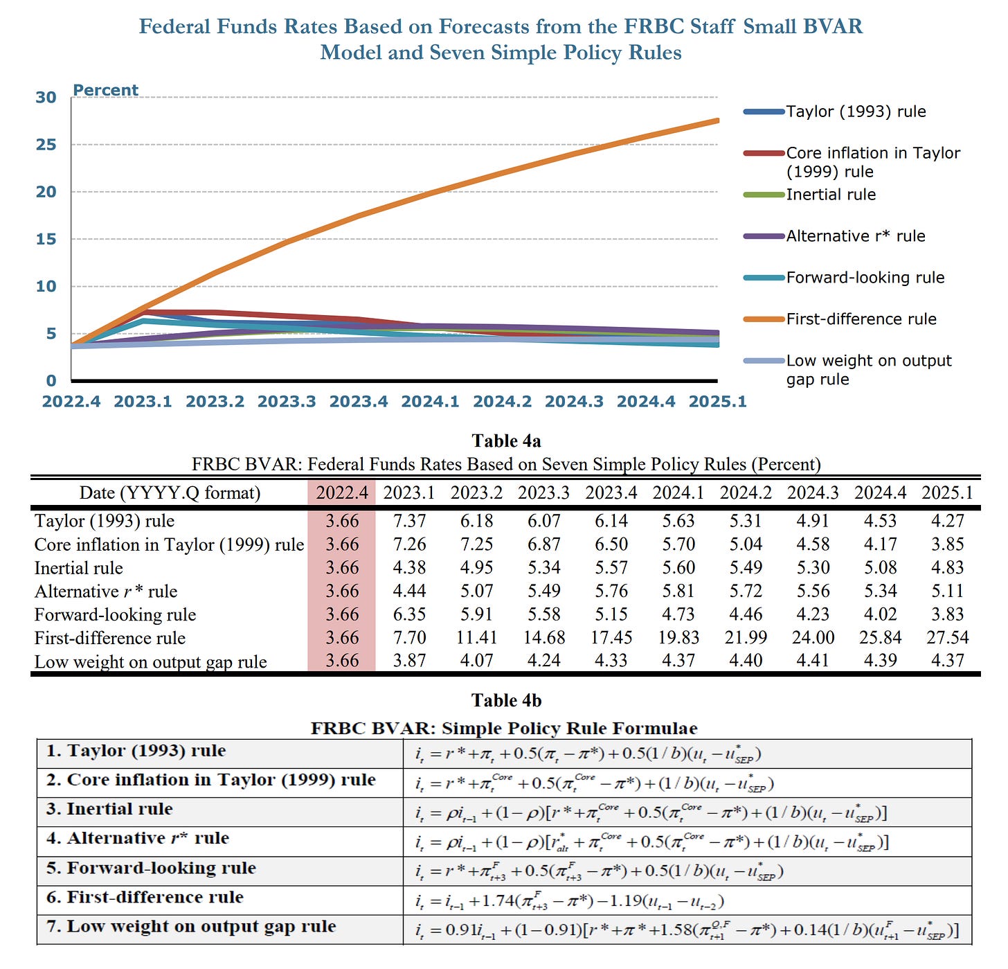 Table 4a provides the results from seven simple monetary policy rules conditional on forecasts from a small statistical Bayesian vector autoregression model consulted by staff at the Federal Reserve Bank of Cleveland (FRBC BVAR). Because the Cleveland Fed staff consult a variety of forecasting models, the FRBC BVAR model forecast does not necessarily represent the official forecast of Cleveland Fed staff or the president of the Cleveland Fed. The Bayesian vector autoregression model consulted by staff at the Federal Reserve Bank of Cleveland (FRBC BVAR) provides forecasts for Personal Consumption Expenditures (PCE) inflation, core Personal Consumption Expenditures (PCE) inflation, and the unemployment rate. Because it does not provide an estimate of the output gap, construct a proxy for the output gap using Okun’s coefficient and the unemployment gap.