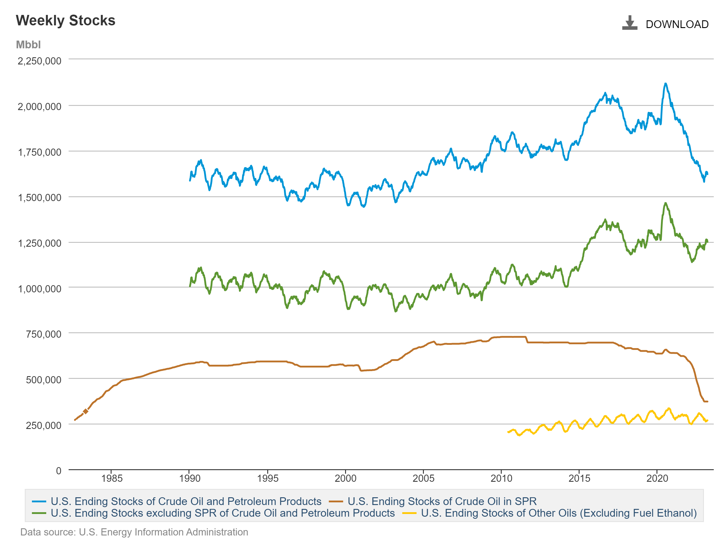 Figure 20. United States’ Weekly Stocks of Petroleum Products Including and Excluding the Strategic Petroleum Reserve (SPR).