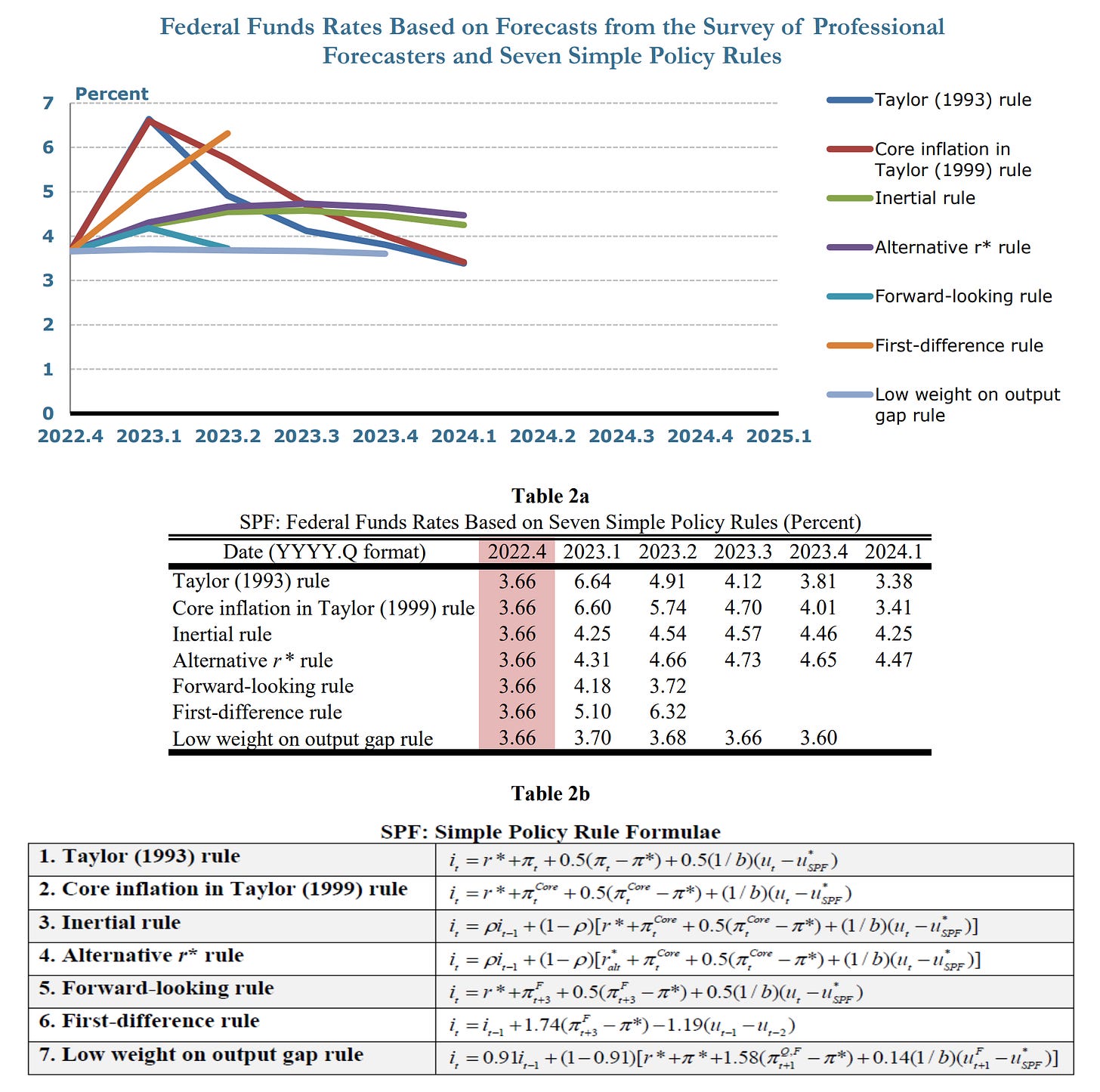 Table 2a provides the results from seven simple monetary policy rules conditional on forecasts from the Survey of Professional Forecasters (SPF). The Survey of Professional Forecasters (SPF) provides forecasts for Personal Consumption Expenditures (PCE) inflation, core Personal Consumption Expenditures (PCE) inflation, and the unemployment rate. Because they do not estimate the output gap, construct a proxy for the output gap using Okun’s coefficient and the unemployment gap. The forecast horizon is shorter than that of other forecasts included here, extending 4 quarters into the future, which limits results coming from the rules.