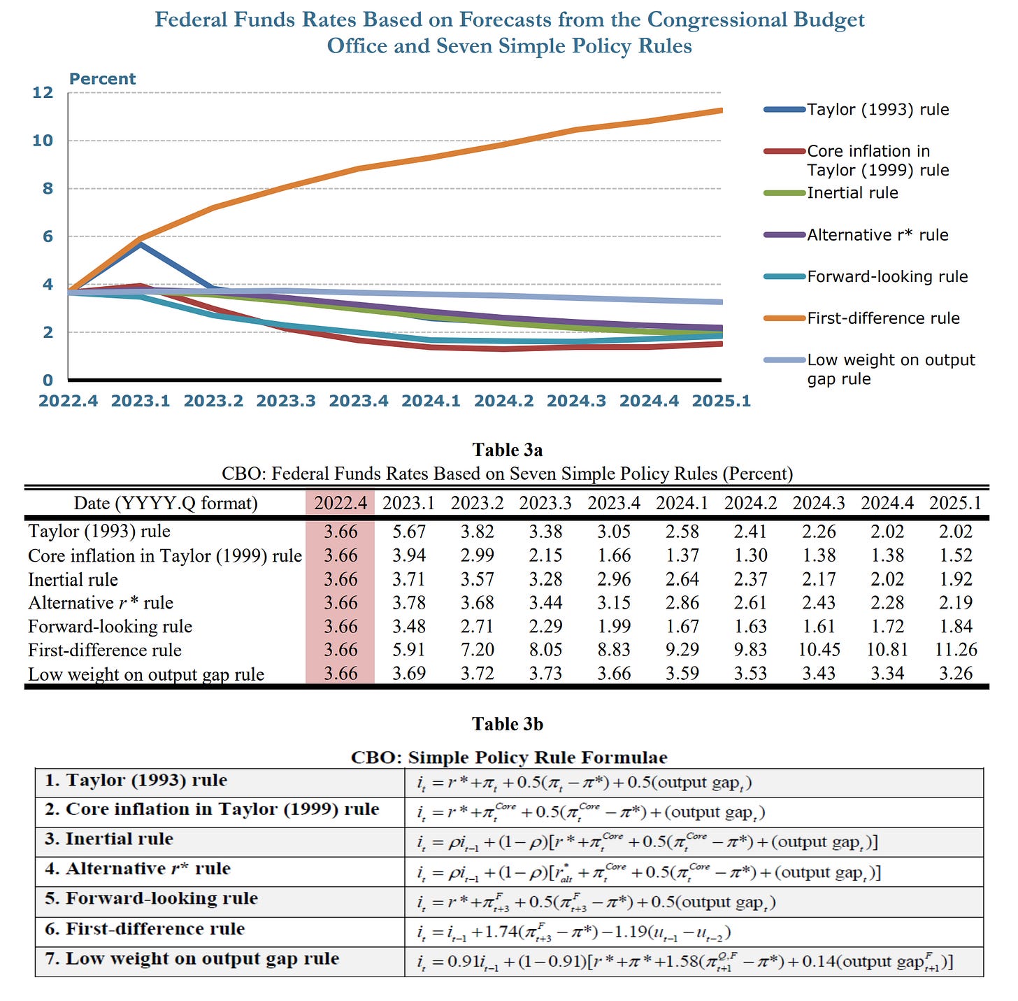 Table 3a provides the results from seven simple monetary policy rules conditional on forecasts from the Congressional Budget Office (CBO). The Congressional Budget Office (CBO) provides forecasts for Personal Consumption Expenditures (PCE) inflation, core Personal Consumption Expenditures (PCE) inflation, the unemployment rate, and the output gap.