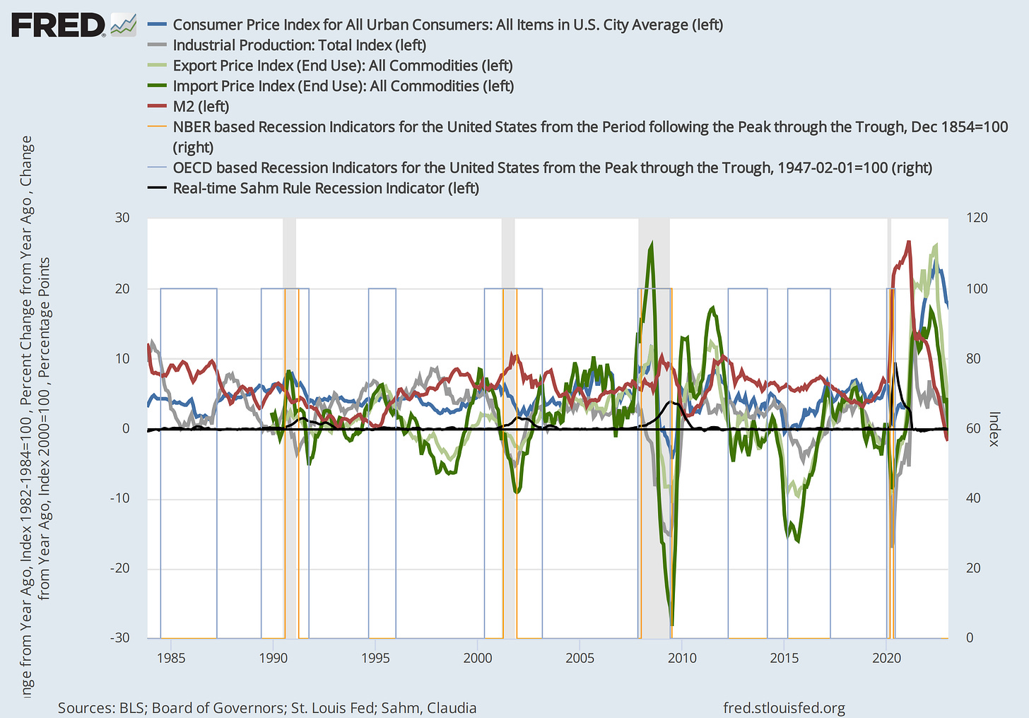 Export prices and import prices in the United States slowed as the M2 change slowed given the Quantitative Tightening which is part of the monetray policy normalization. The next chart shows the change in the consumer price index, which is directly correlated to the change in industrial production, which affects import and export prices as the variation in production increases or decreases prices given the supply and demand dynamics. The M2 change does affect goods prices given the fact that the more M2 is supplied, the higher the prices will be; the slowdown in M2 given the Quantitative Tightening affects the change in prices but in a lagged way, as can be seen on the next chart. The NBER, OECD, and Sahm Rule recession indicators are also in the chart. As explained before.